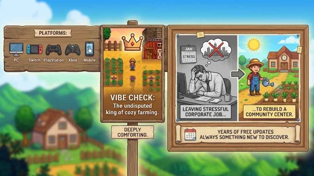 • Why it’s perfect for the New Year: We cannot talk about cozy games without mentioning the masterpiece that defined the modern genre. Stardew Valley remains deeply comforting. Leaving your stressful corporate job to clear weeds, plant parsnips, and rebuild a community center is a timeless fantasy. With years of massive, free updates, there is always something new to discover.