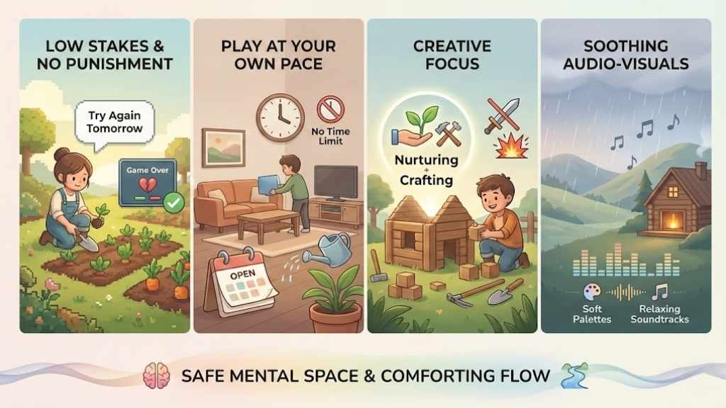 By removing the pressure to perform, these games create a safe mental space where you can simply exist and find a comforting sense of flow.