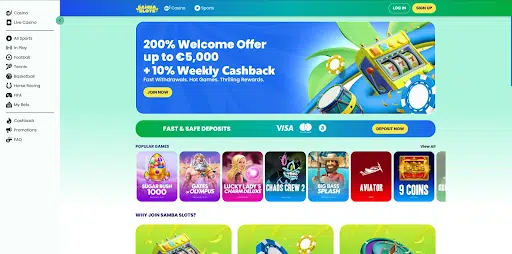 SambaSlots is one of the best crash gambling sites due to its generous 200% non-sticky bonus of up to $5,000, along with 50 free spins. The non-sticky format allows players to withdraw winnings from their initial deposit without being required to wager the bonus funds first.