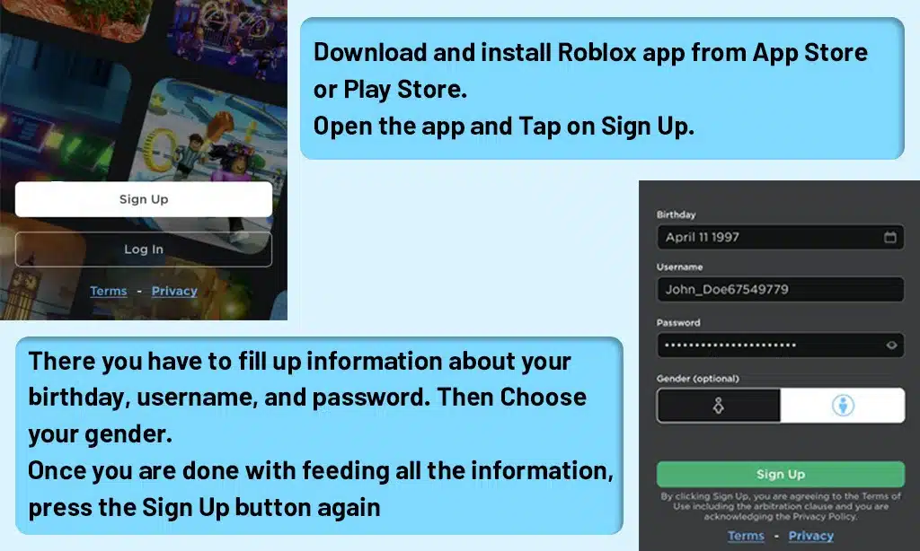 Step 4: At this point, you have to click on the “Sign Up” button. Here, you must remember that, as soon as you enter this button, you agree to the terms and conditions of Roblox.