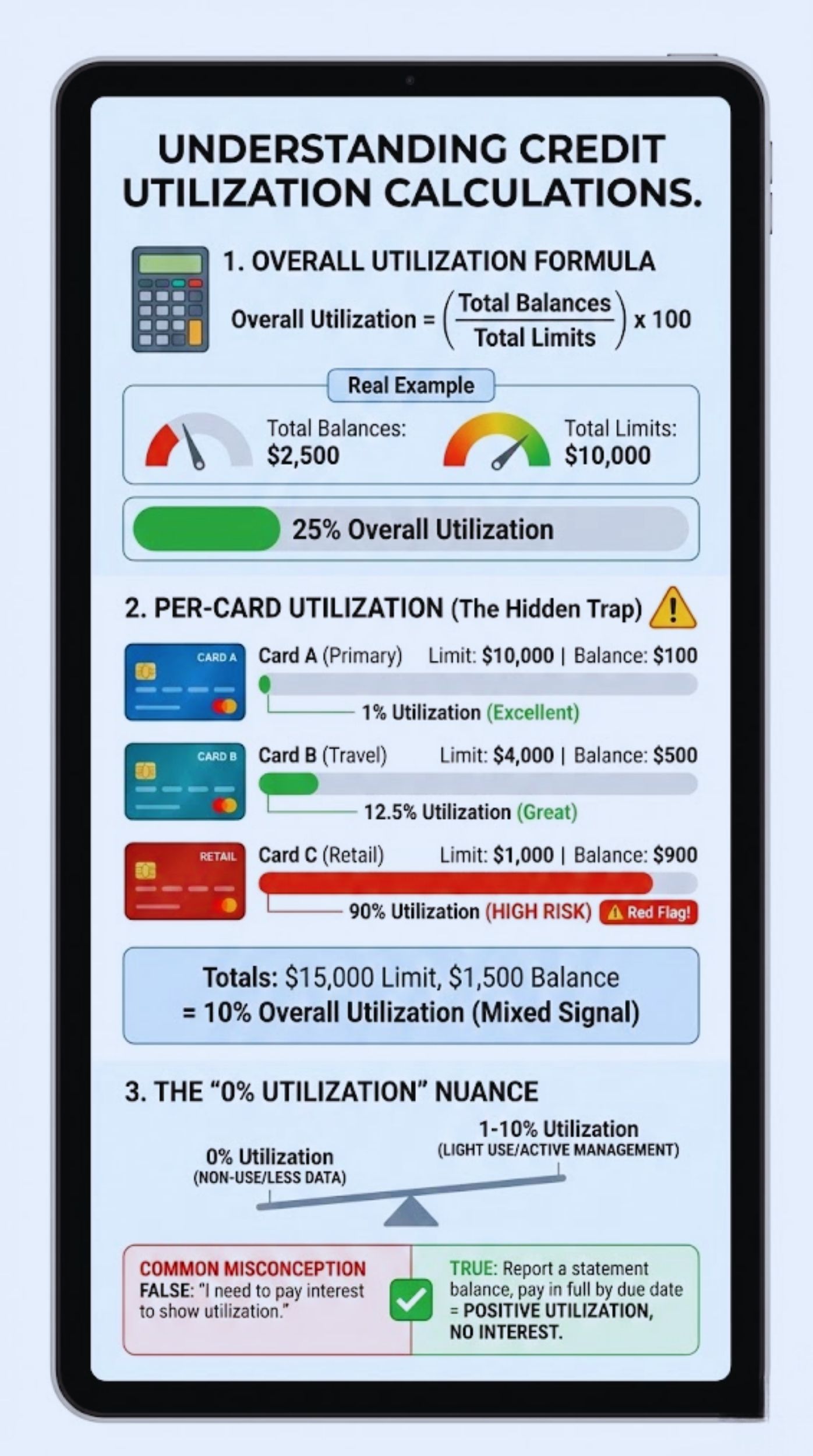 The math behind credit utilization is straightforward, but the way it is applied involves two distinct calculations. overall utilization and per-card utilization. Understanding both is the key to preventing surprise score drops.
