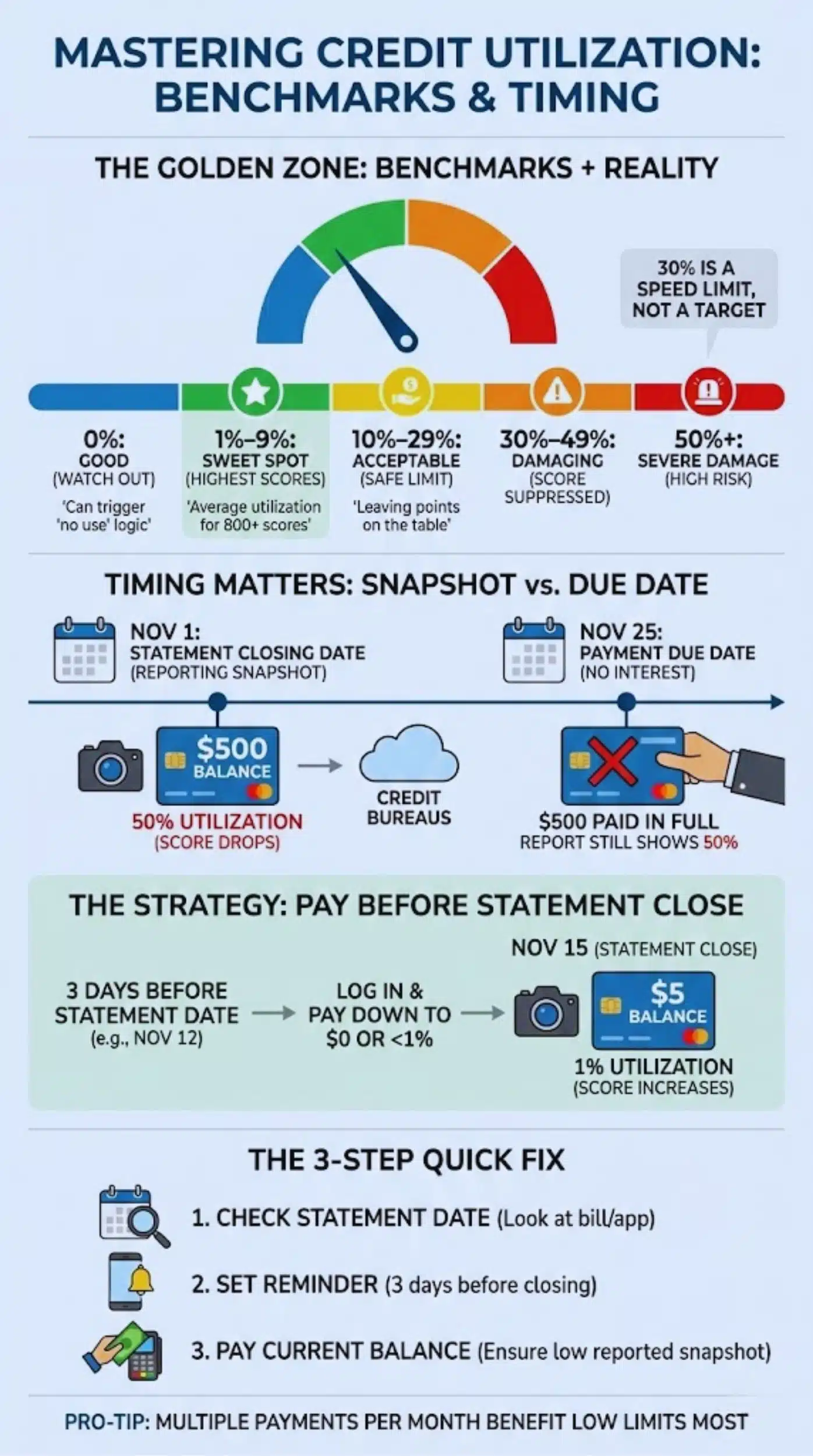 Credit utilization is the lever you have the most control over. Unlike payment history (which takes 7 years to heal), utilization can often be fixed in 30 days. Credit utilization is the heartbeat of your credit score. It fluctuates, it reacts to your choices, and it is the fastest way to manipulate your creditworthiness.