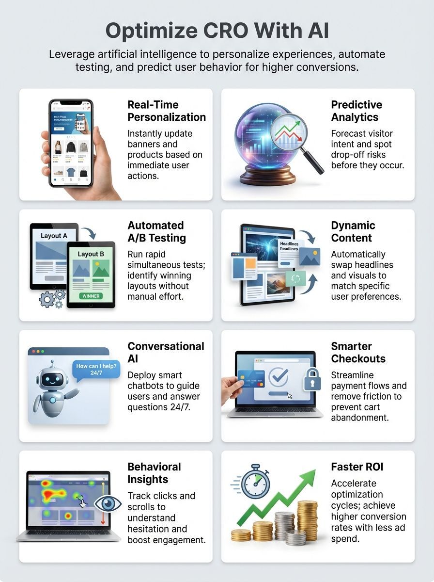 AI-driven CRO helps you turn more visitors into happy customers by using real data, smart tests, and quick changes. Tools like automated A/B testing and chatbots make it simple to boost performance without extra headaches or wasted time.