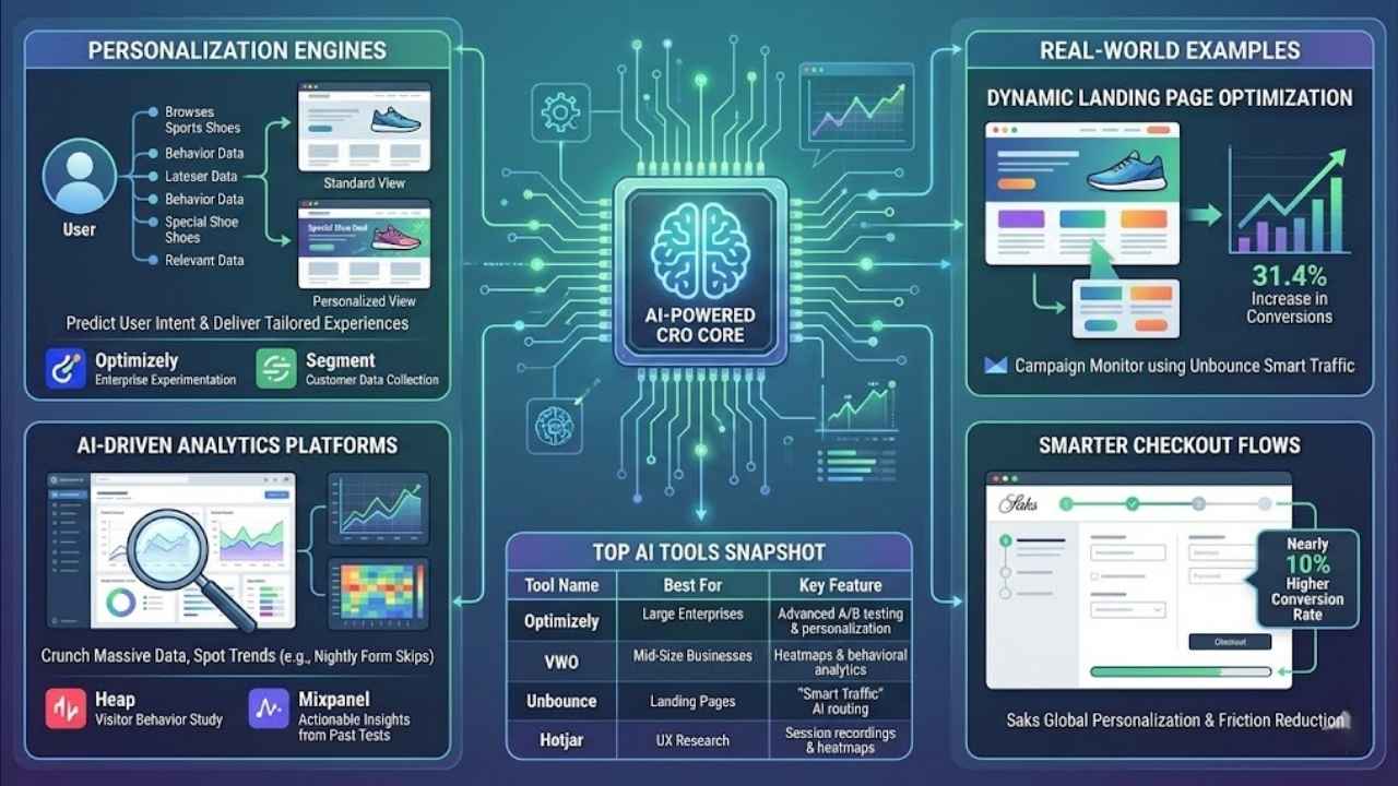 Checkouts can make or break your sale. AI-driven CRO tools watch how people move through the checkout page to find friction points. For example, Saks Global used AI to personalize their homepage and checkout flow, which led to a nearly 10% higher conversion rate.