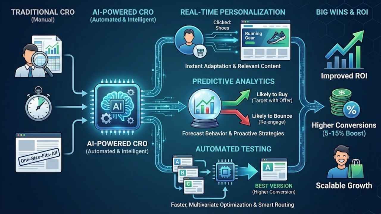 Predictive analytics uses AI to spot trends before they happen. These systems analyze traffic data, conversion funnel actions, and engagement metrics to forecast which visitors are most likely to buy or bounce. A 2025 report from Top Analytics Tools notes that companies using predictive AI for CRO have reported conversion increases of up to 25%.