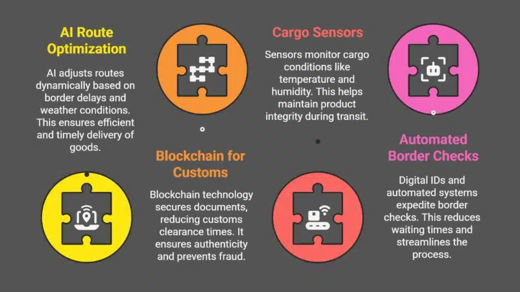 Tech is changing cross-border logistics fast. AI tweaks routes on the fly if borders slow down or storms hit. This keeps goods moving without wasting time.