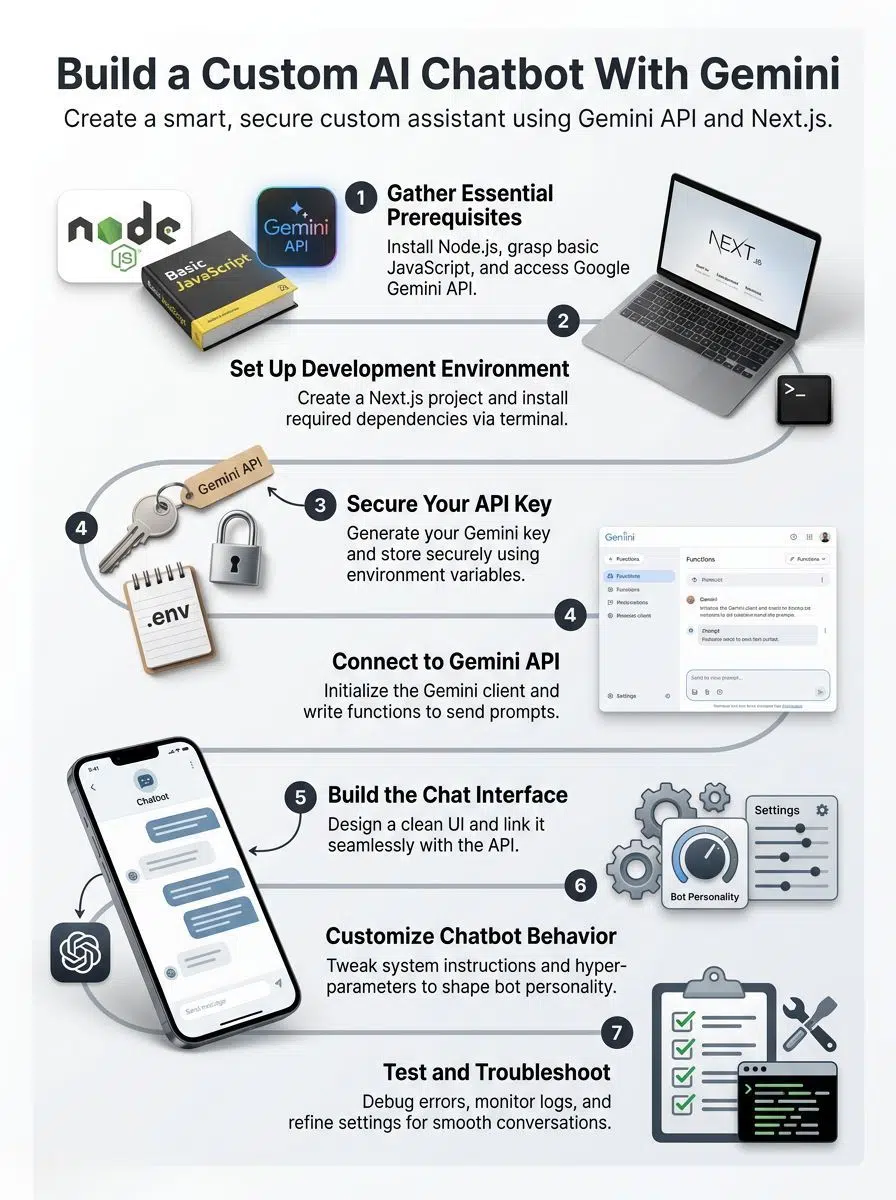 You just learned how to build a custom AI chatbot with the Gemini API from start to finish. We covered everything from securing your keys to tweaking the bot’s personality. These strategies use accessible tools like Next.js, making the project highly manageable.