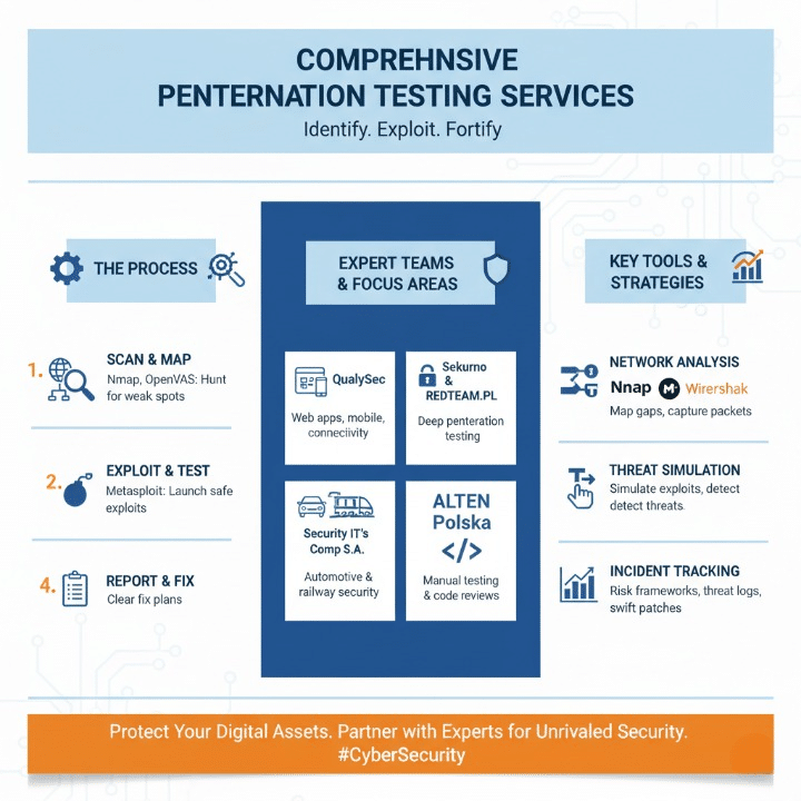 Experts use Nmap, a network mapper, and OpenVAS, a vulnerability auditor, to hunt for weak spots. Then they launch safe exploits with Metasploit, a pen-test toolkit, and hand over clear fix plans.