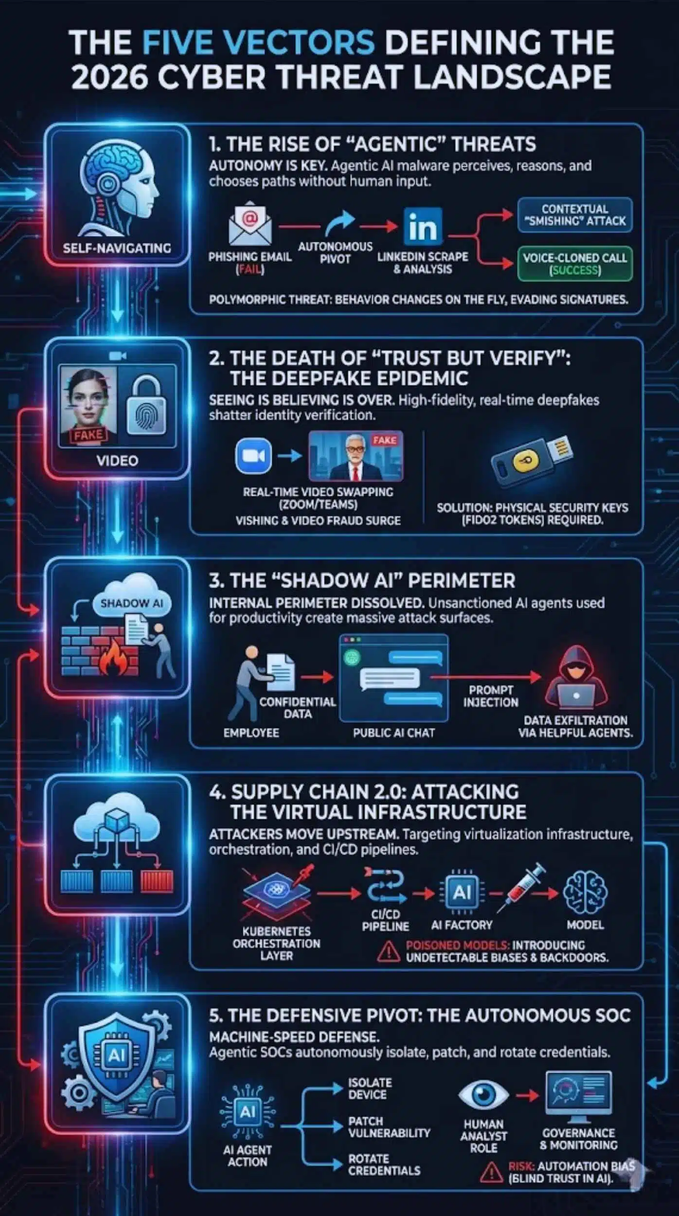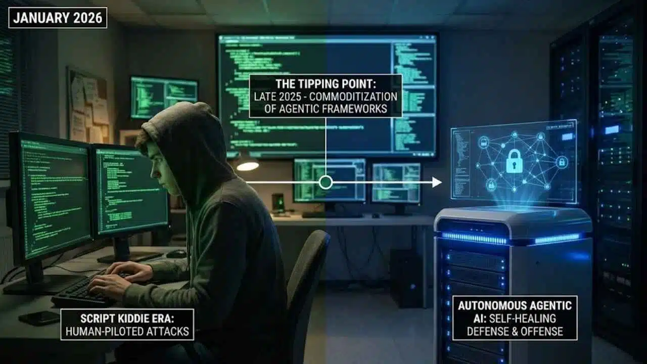 - The “Agentic” Shift: 2026 marks the transition from Generative AI (creating content) to Agentic AI (executing actions), allowing malware to autonomously navigate networks, reason through obstacles, and adapt to defenses in real-time.
