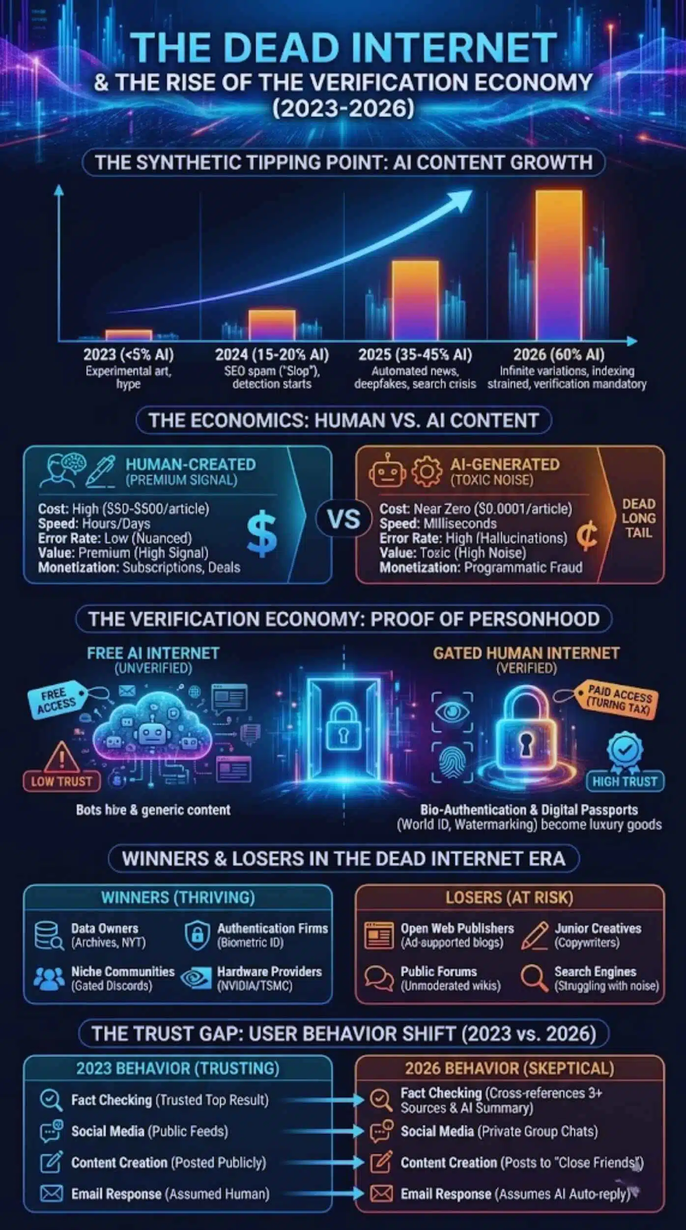 The “Dead Internet” is no longer a conspiracy; it is a statistical reality of the 2026 infrastructure. The question is not how to stop the flood, but how to build arks—trusted, verified spaces—that can float above it.