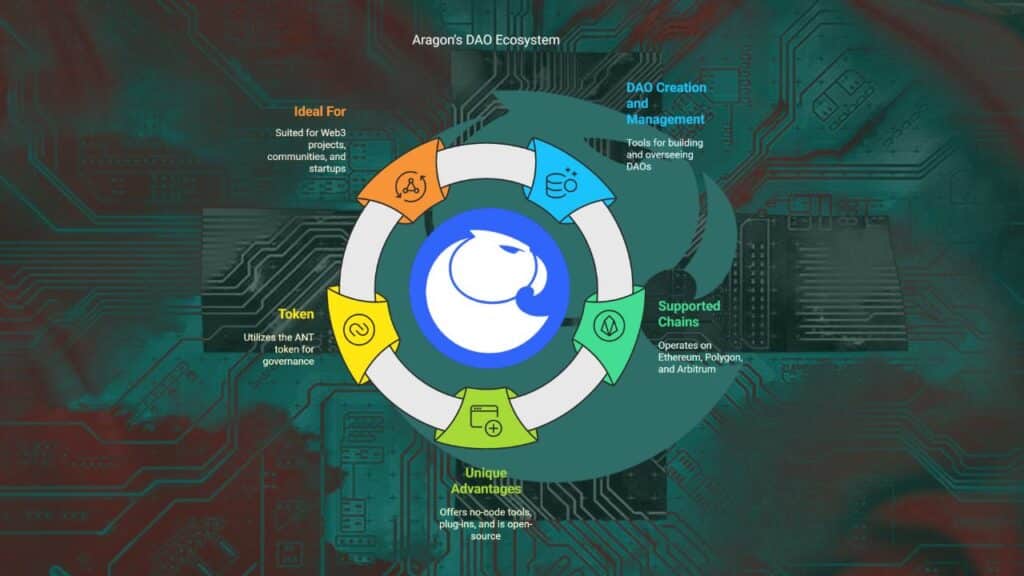 Aragon helps anyone build and run a DAO (Decentralized Autonomous Organization). You can set rules, vote, and manage funds without coding.