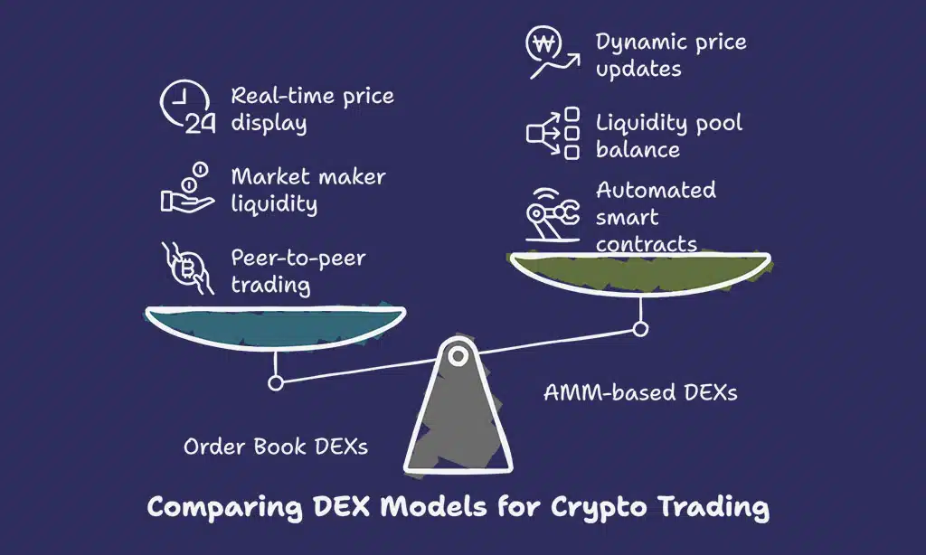 Market makers add liquidity to the book and collect trading fees. A live order book displays bids and asks in real time. This model contrasts AMM-based DEXs with liquidity pools and price curves.