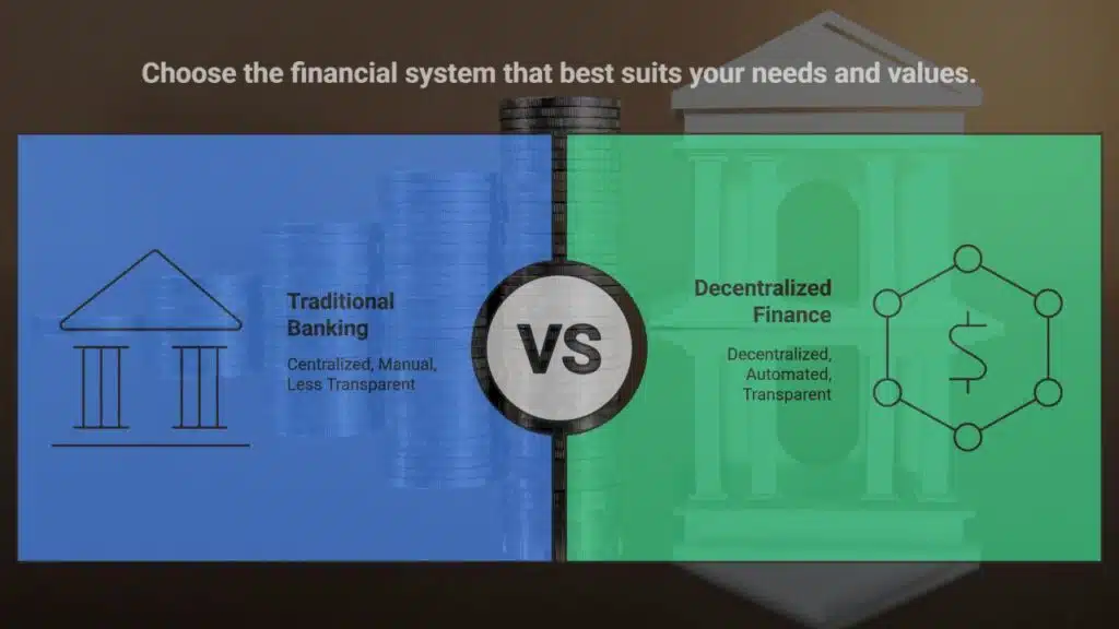 DeFi and traditional banking work in very different ways. DeFi uses smart contracts on blockchain networks, while banks rely on manual methods and central control.
