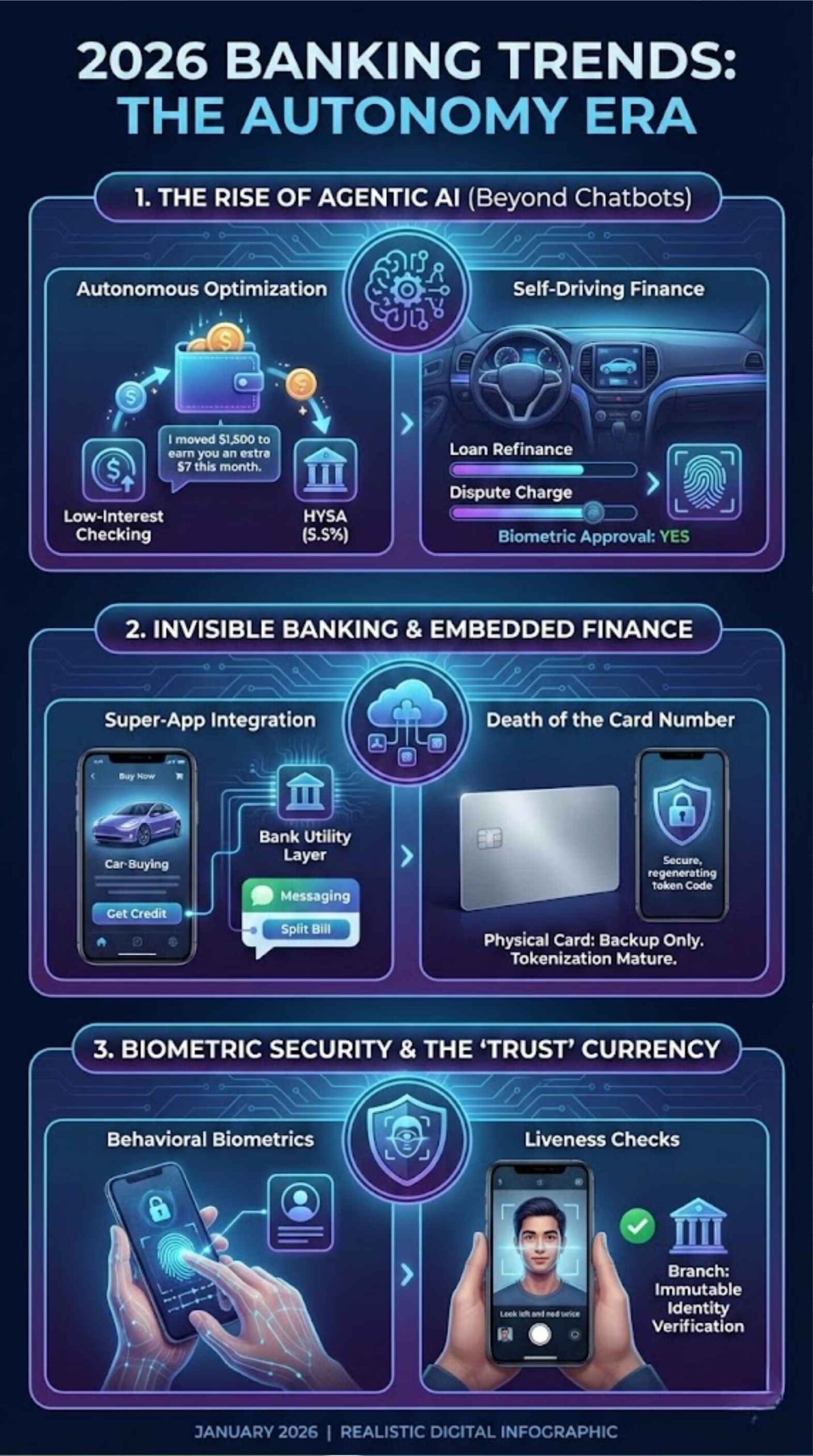For the day-to-day, 2026 belongs to the algorithms. The “bank” is no longer a place you go, but a service that happens in the background, optimized by AI, and secured by your own biology.