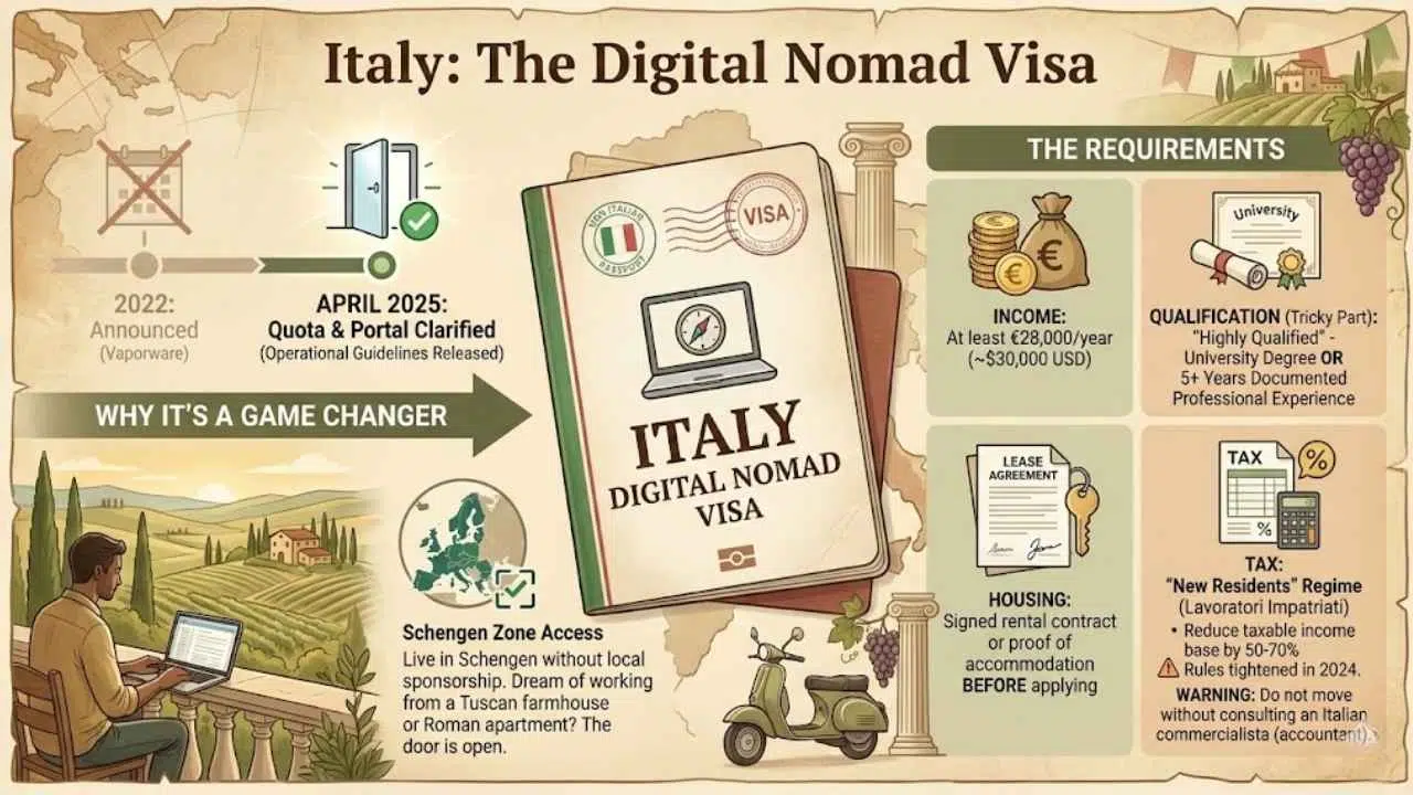 Italy technically announced this visa in 2022, but it was “vaporware” (non-existent) for years. Late 2025 finally saw the release of clear operational guidelines that allowed non-corporate freelancers to actually apply and get approved.