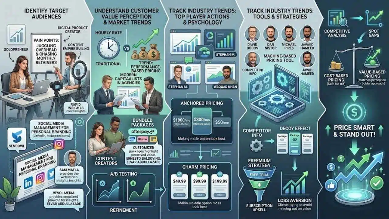 Stay alert to shifts in the digital services world. You spot trends by watching what top players do with their pricing models. Think of experts like Stephan M. or Waqqad Khan, who share insights on sales pages about pricing psychology.