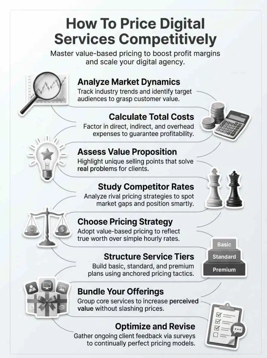 You’ve learned to analyze market trends, calculate your costs, and assess your value to price digital services right. These steps make pricing simple and quick to apply in your business.