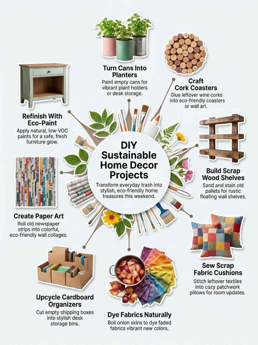 You’ve seen how upcycled tin cans turn into planters, and scrap wood builds shelves in no time. These projects prove sustainable decor fits any weekend schedule, with simple steps that save money and the planet.