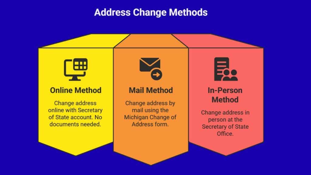 It doesn’t take long to change your address in Michigan. You can do it in a few minutes online, in around 20 minutes at an office location, and around a week if you do it by mail.