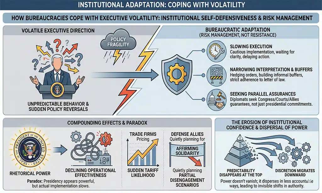 One underexplored consequence of Donald Trump’s unpredictable behaviour is institutional self-defensiveness. When executive direction becomes volatile, bureaucracies adapt by slowing execution, narrowing interpretation, or building informal buffers. This is not resistance in the ideological sense, but risk management.