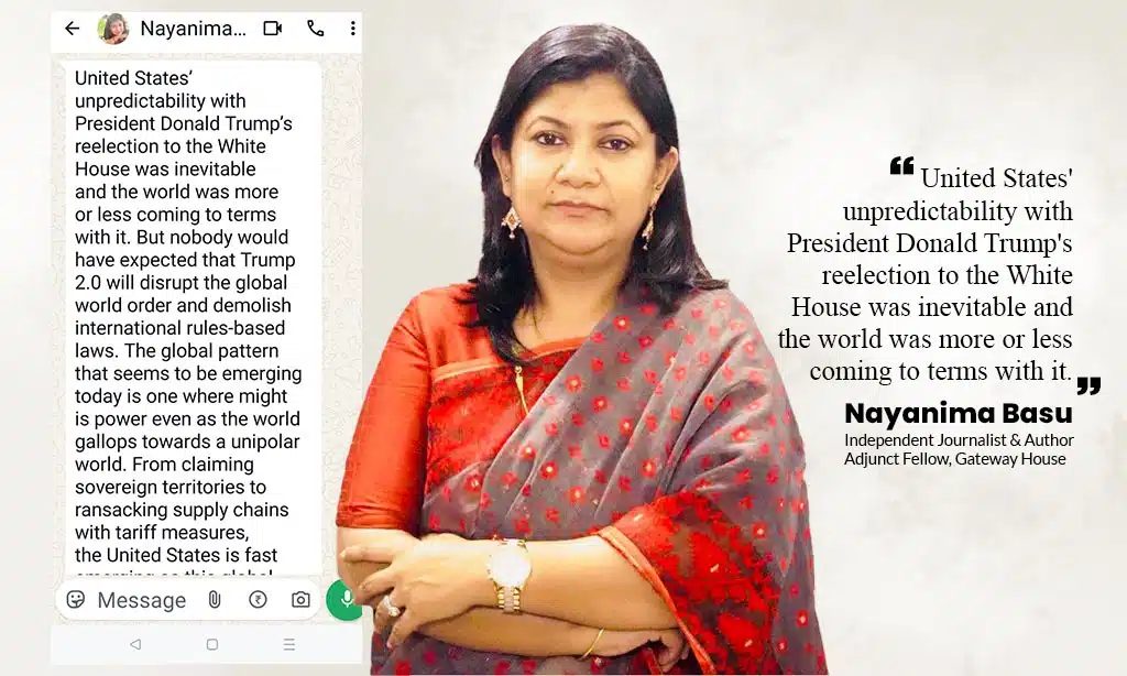 “The United States’ unpredictability with President Donald Trump’s reelection to the White House was inevitable, and the world was more or less coming to terms with it. But nobody would have expected that Trump 2.0 would disrupt the global world order and demolish international rules-based laws. The global pattern that seems to be emerging today is one where might is power, even as the world gallops towards a unipolar order. From claiming sovereign territories to ransacking supply chains with tariff measures, the United States is fast emerging as a global hegemon,” says Nayanima Basu, independent journalist and author, and adjunct fellow at Gateway House.