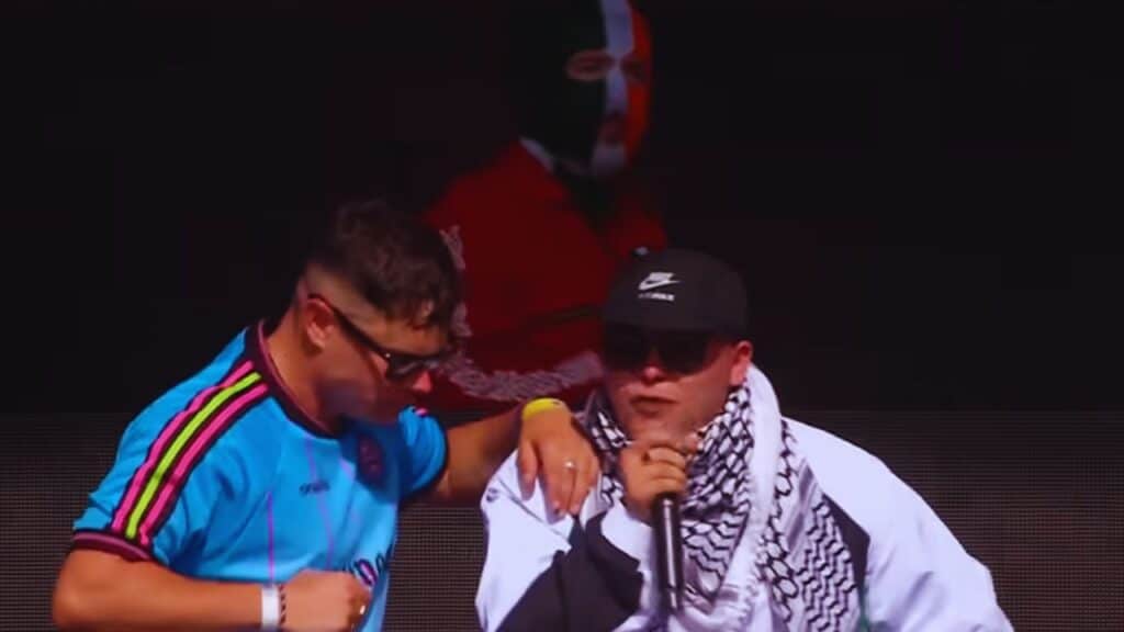 Kneecap is a Belfast-based hip hop trio known for politically charged lyrics that mix Irish and English. Their music frequently criticizes colonialism, police abuse, and, more recently, Israel’s military campaign in Gaza.