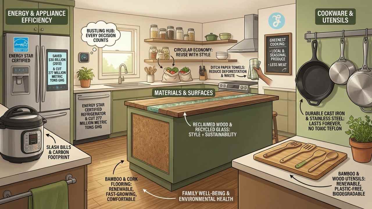 Kitchens serve as major centers of energy use and waste in homes. You make healthy kitchen choices that positively impact both the environment and personal finances. Imagine your kitchen as a bustling hub, where every decision counts toward a greener planet.