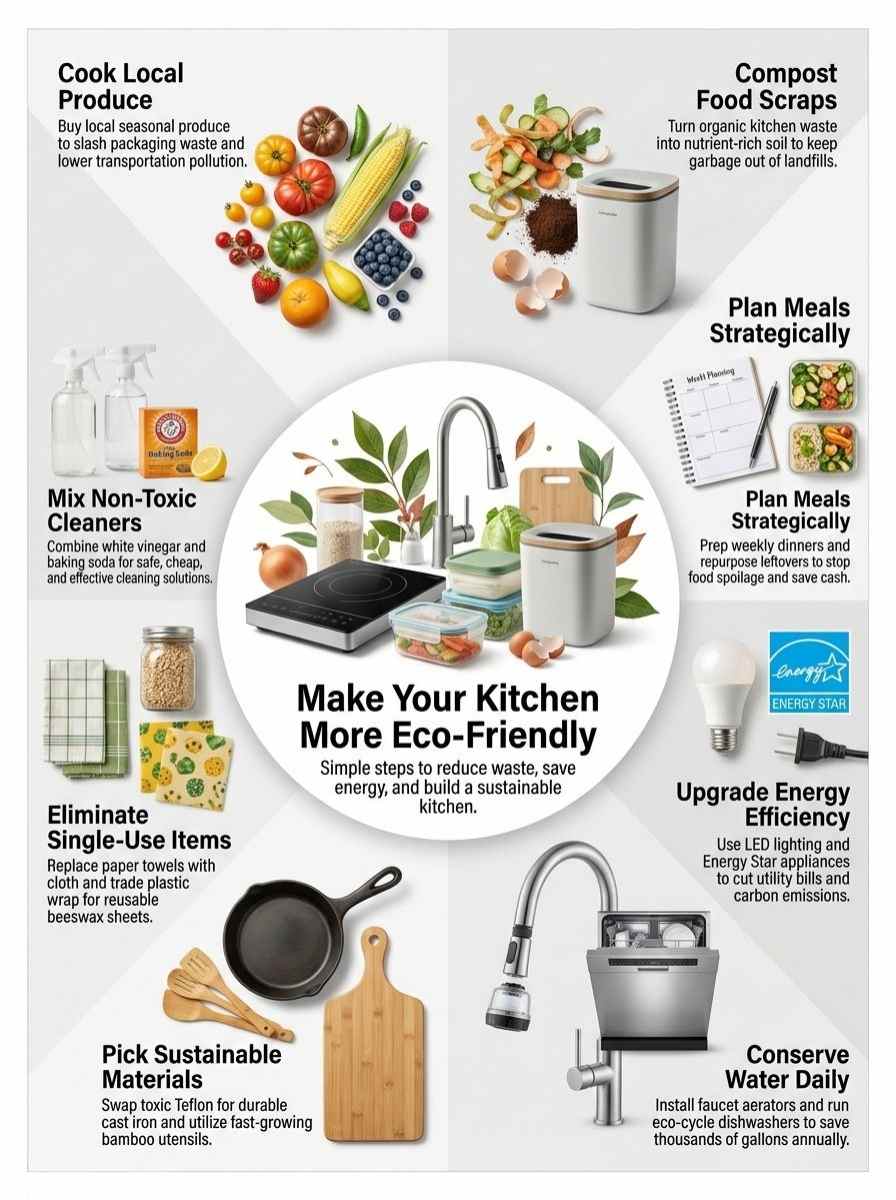 You’ve learned simple ways to green up your kitchen, from cooking with local ingredients and composting scraps to picking energy-smart appliances and ditching single-use plastics. These tips fit right into your daily routine, no big overhauls needed, and they save time, money, and the planet all at once.