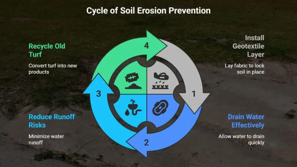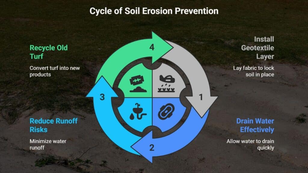 Heavy rains wash away soil on slopes. Artificial grass uses a geotextile layer to lock soil in place. That fabric layer sits under the blades and traps dirt. Synthetic turf lets water drain fast and cuts runoff risks.