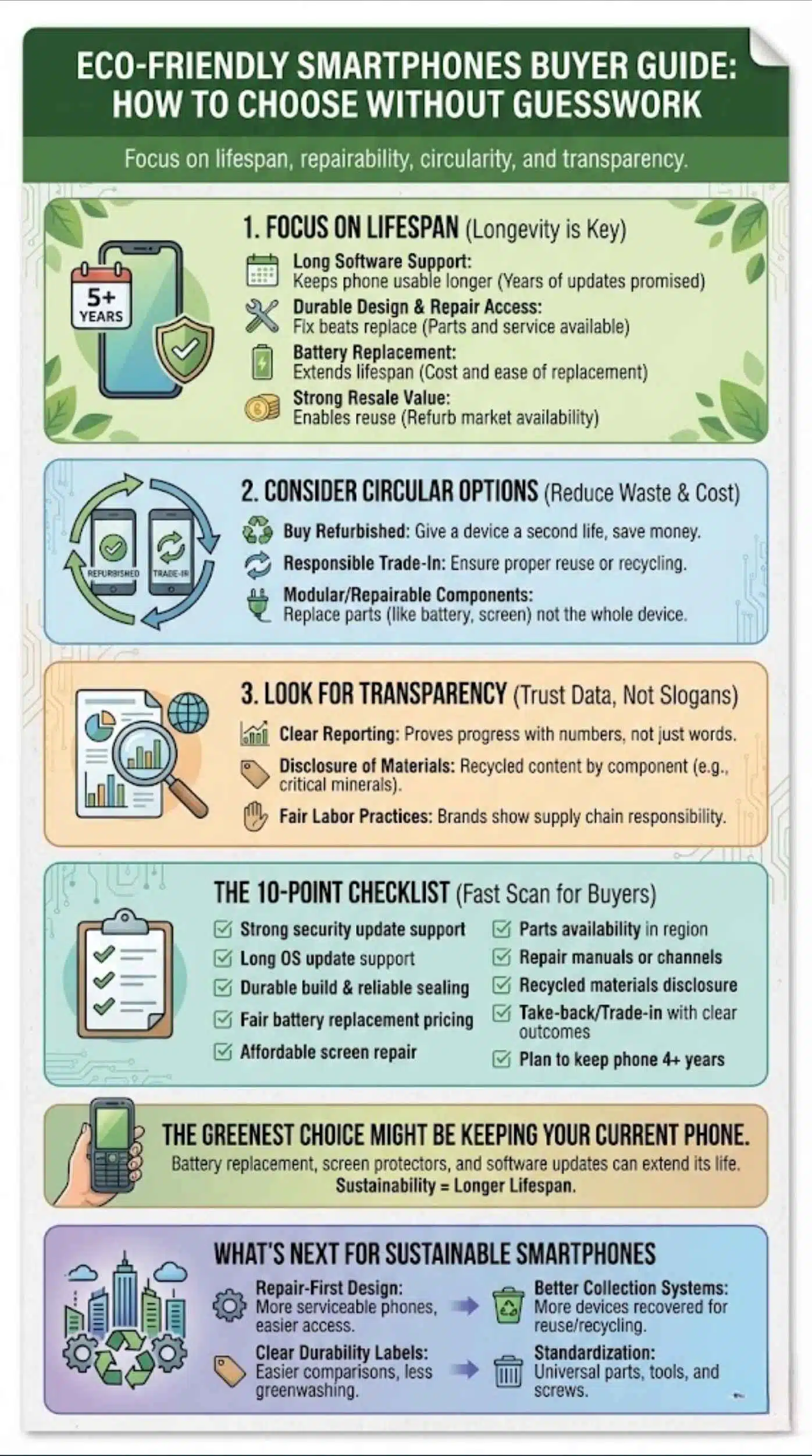 If you want to evaluate a phone quickly, ask three questions. How long will it stay secure and useful? How easy and affordable is it to repair? What happens to it at the end of its life? These questions lead you to real impact.