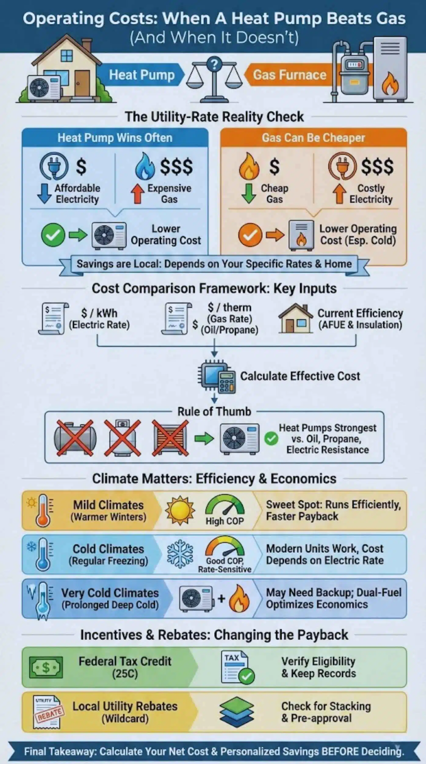 If a heat pump has a higher net installed cost but saves a lot each year, payback is faster. If energy savings are small, payback can stretch out—unless incentives cover a large part of the upfront cost.