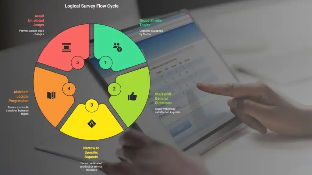 Question order matters. Group similar topics together and move from general to specific. For example, start with broad questions about overall satisfaction, then narrow down to specific aspects like product quality, delivery times, or support experiences.