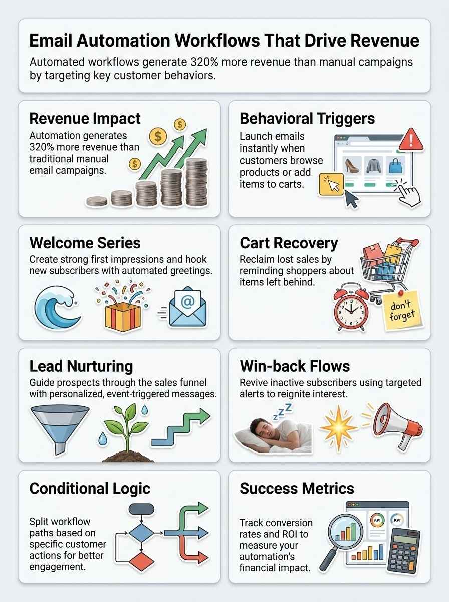 This setup boosts sales, as automated emails generate 320% more revenue than manual ones. Smart audience segmentation plays a big role here, it creates personalized campaigns that engage customers and drive revenue.