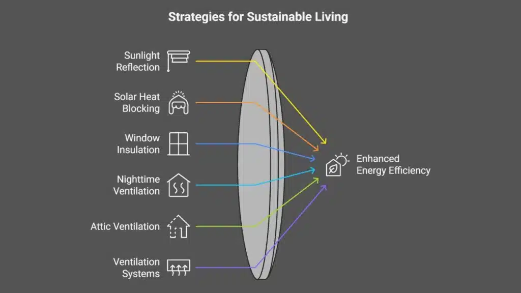- Boost insulation in key areas: add 18″ of attic insulation to reach R-49 and cut cooling costs by 50%, wrap ducts in R-6 sleeves, and seal all joints.