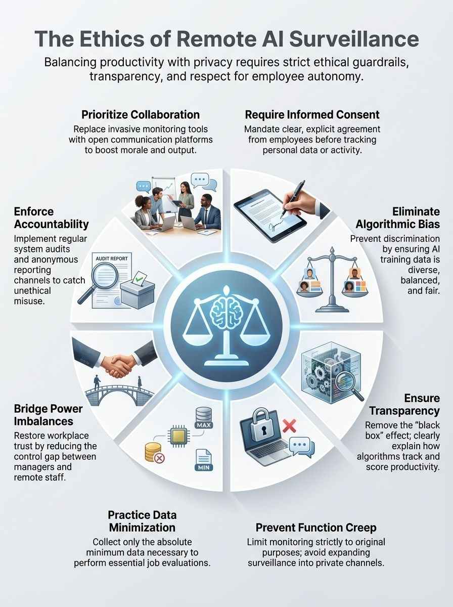 Ethical problems increase when these AI systems are hard for employees to understand or question. Trust between employers and employees can decline if people see that these monitoring tools treat some groups unfairly. Ethical frameworks must address this issue so workplace surveillance does not harm worker rights or create inequality in remote workforce settings.