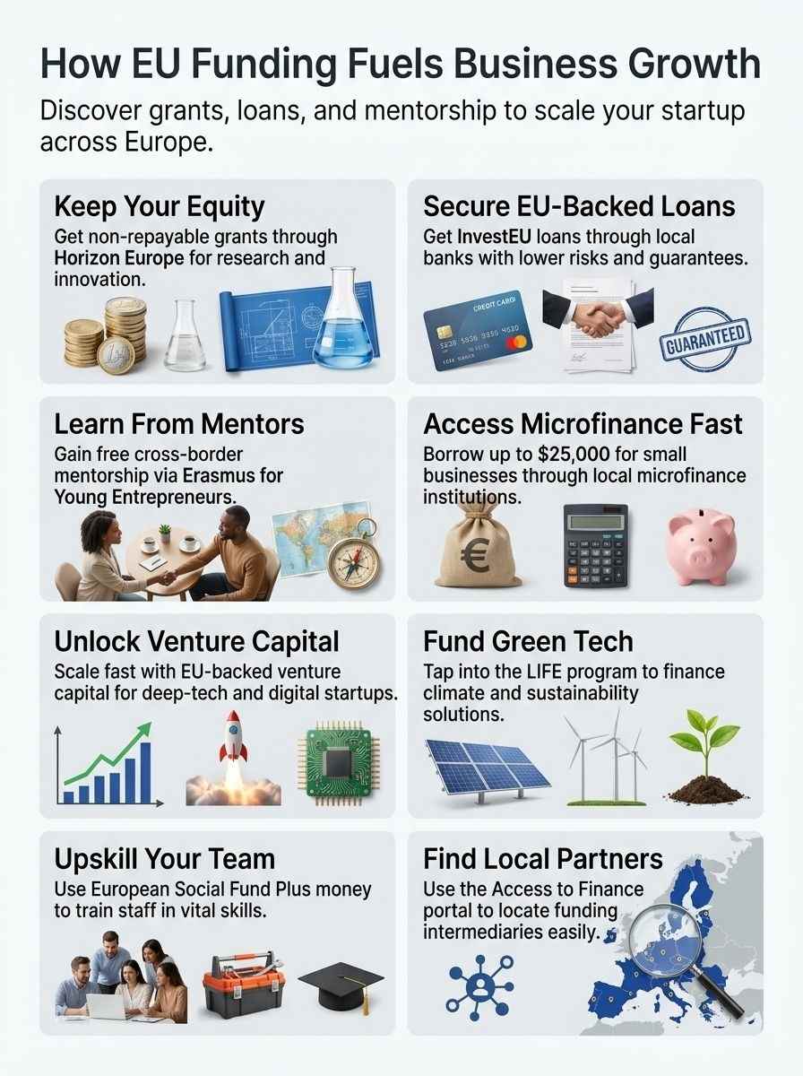 The European Union opens many doors for business owners through different types of financial support. You can get grants you do not repay, loans with solid guarantees backing them, or equity funding that gives investors a stake in your company.