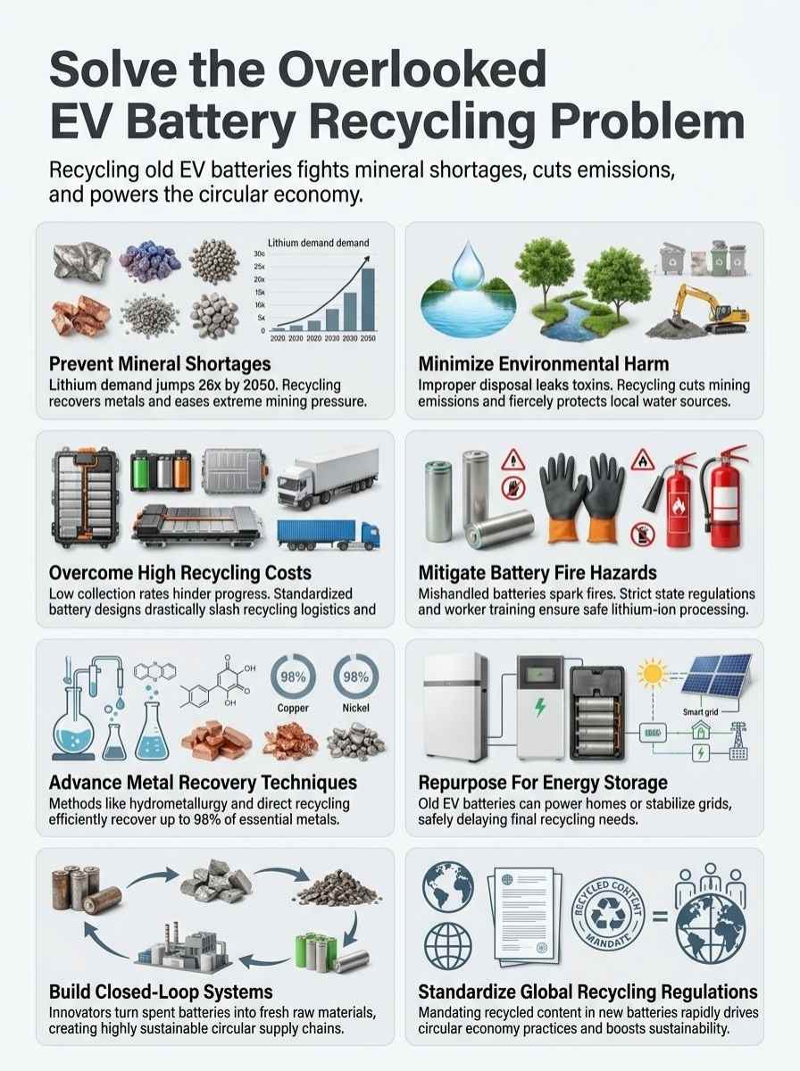 Push for better recycling laws and tech that makes it easier to reuse battery parts. Companies should step up too, designing cars with recycling in mind from the start.