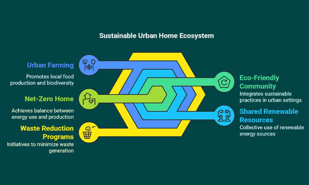 The home is located in a development that prioritizes green living, featuring shared renewable energy resources, urban farming, and waste reduction programs. The home itself is equipped with solar panels, efficient insulation, and energy-saving appliances, which help it achieve net-zero status.