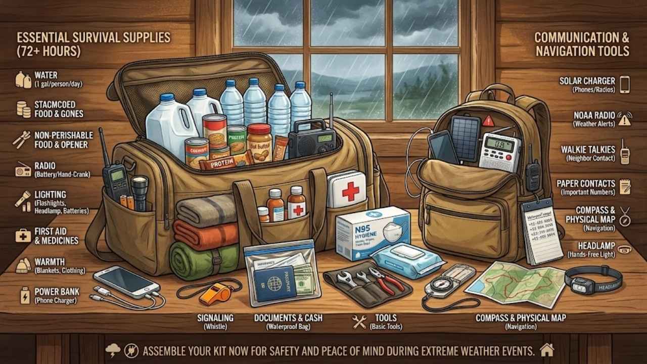 Everyone should keep emergency supplies ready at home. These items can save lives during extreme weather events, like winter storms or power outages. You need enough to last at least 72 hours.
