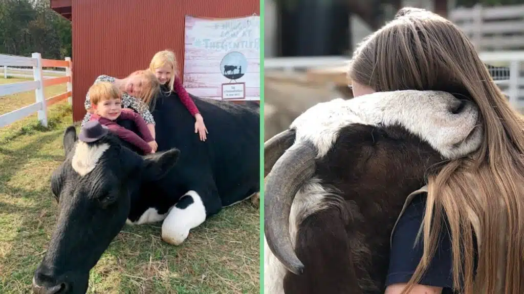 One of The Gentle Barn’s most well-known initiatives is Cow Hug Therapy, where individuals sit quietly with a rescued cow, wrap their arms around its large, steady body, and experience deep calm and connection. The effect on people is profound: lowering anxiety, creating space for emotional processing, and fostering trust where trust was lost.