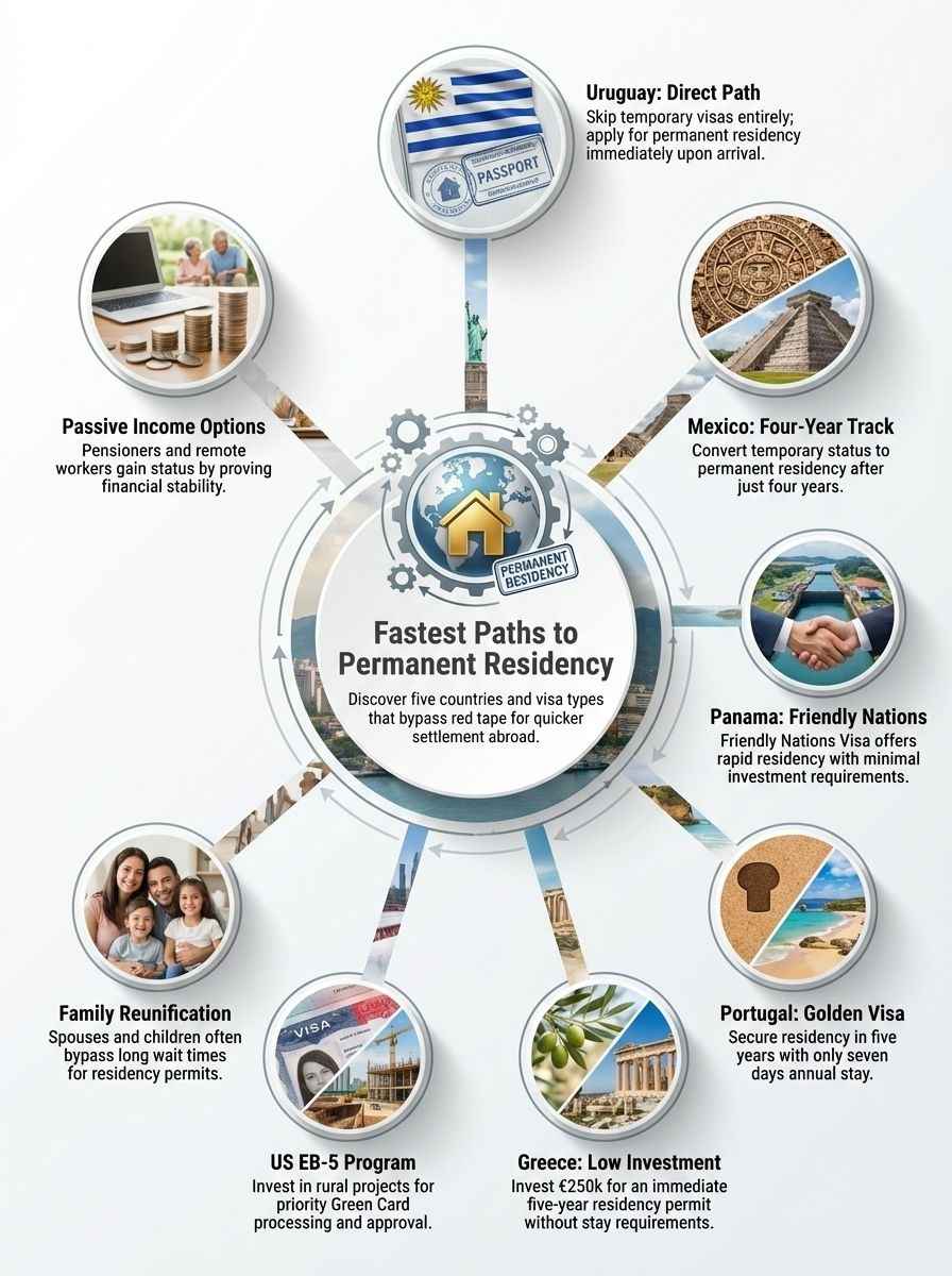 If you have capital to deploy, investment visas are almost always the fastest route because they bypass the need for job offers or family connections.