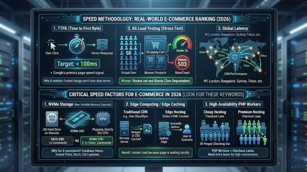 To ensure these rankings were fair and accurate for the 2026 landscape, we didn’t just run a generic speed test. We simulated real-world e-commerce scenarios.