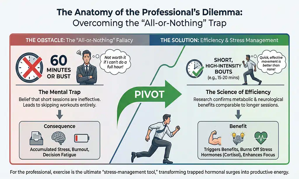 The primary obstacle for the time-crunched professional is the “all-or-nothing” fallacy. This is the mental trap that suggests if you cannot commit to a 60-minute session, the workout is not worth doing. In reality, the science of exercise physiology has pivoted toward efficiency. Research now confirms that short, high-intensity bouts of movement can trigger metabolic and neurological benefits comparable to much longer, moderate sessions.