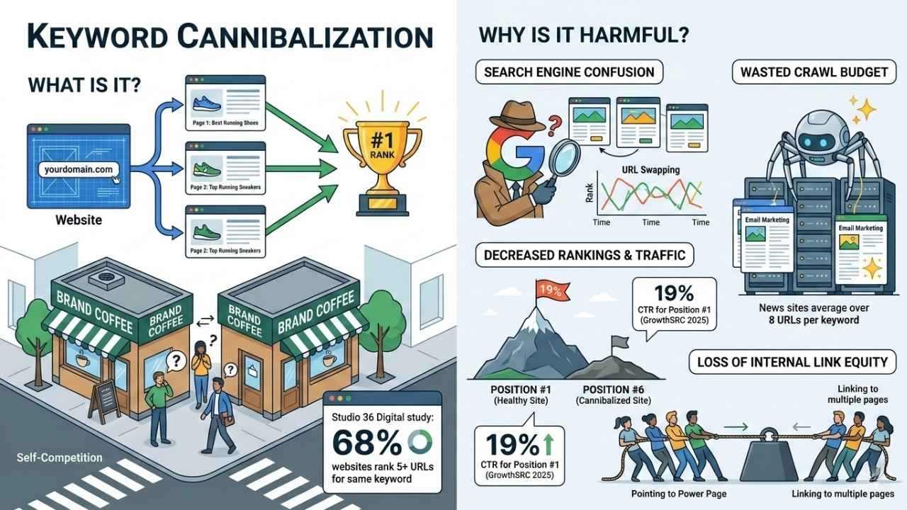 “A 2026 study by Studio 36 Digital found that 68% of websites rank 5 or more URLs for the same keyword. This dilution is one of the most common reasons for stagnant growth.”