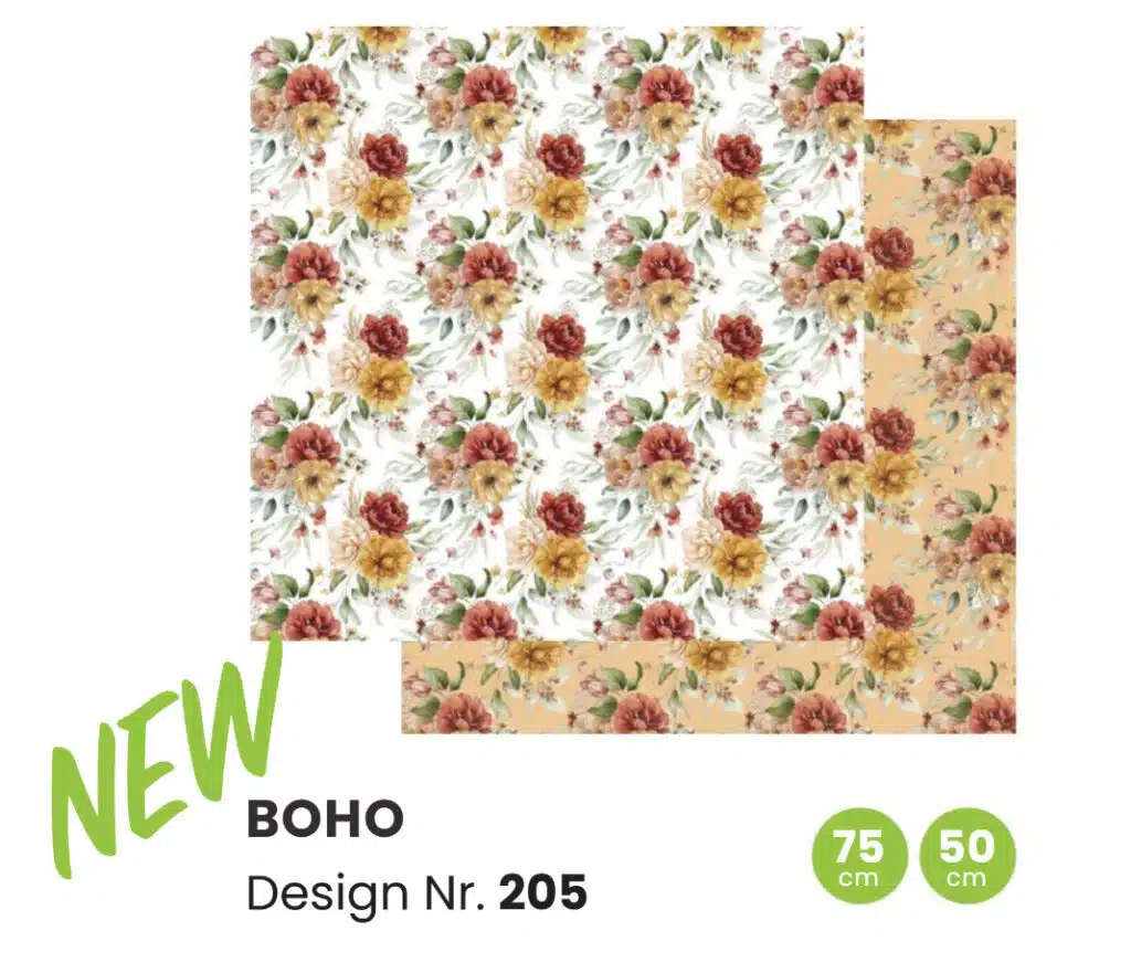 Ritva Borg, designer of Carccu®’s flower paper patterns, says “Our ‘Boho’ flower paper design captures the latest trends in interior decor and floral packaging perfectly—lots of neutral tones.