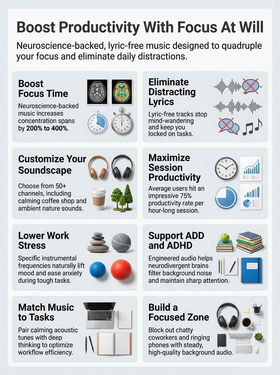 Focus@Will builds each soundtrack to match different work styles. Instrumental music, like classical or ambient tracks, helps people concentrate and finish tasks without distractions from lyrics.