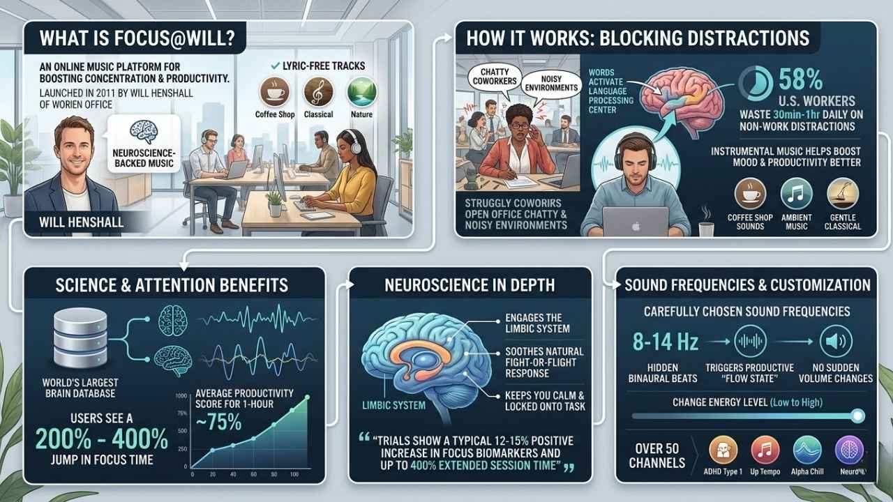 Scientists have put music and focus under the microscope. A study in PLOS One found that certain instrumental songs can lift mood and help people get more done. Focus@Will took this further by using neuroscience to shape their playlists for productivity.