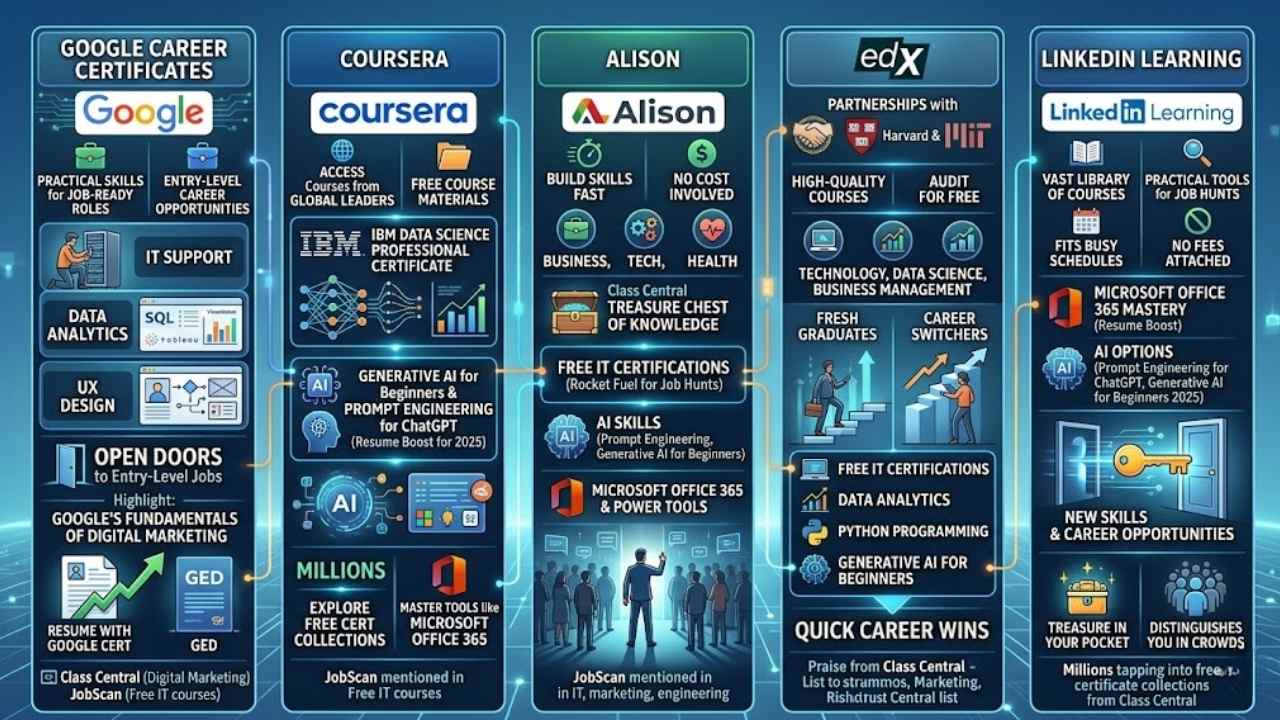 These courses come at no cost, yet they pack real value. They open doors to new skills and better career shots. JobScan highlights similar free paths across industries, and free IT certifications here elevate your game fast.