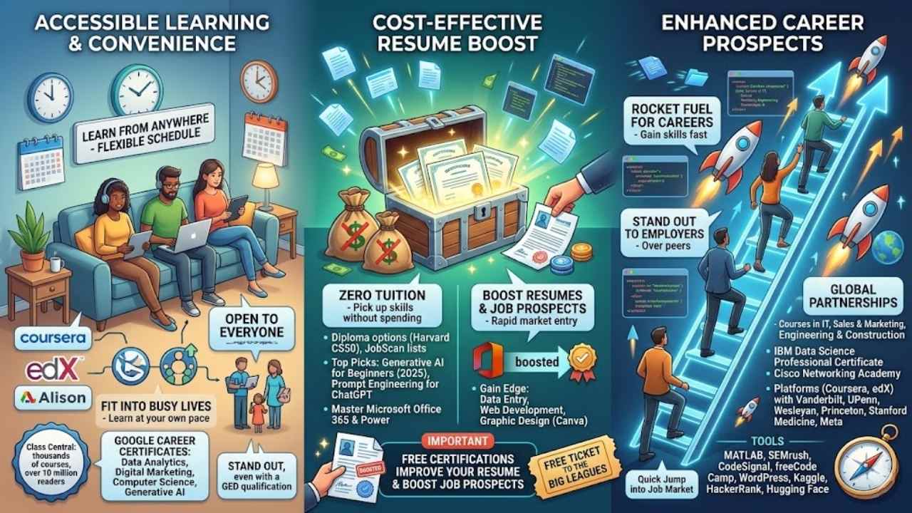 Free online certifications open doors for everyone, no matter your schedule or location. You grab them from platforms like Coursera, edX, or Alison, right from your couch. Class Central lists thousands of these free courses, read by over 10 million people.