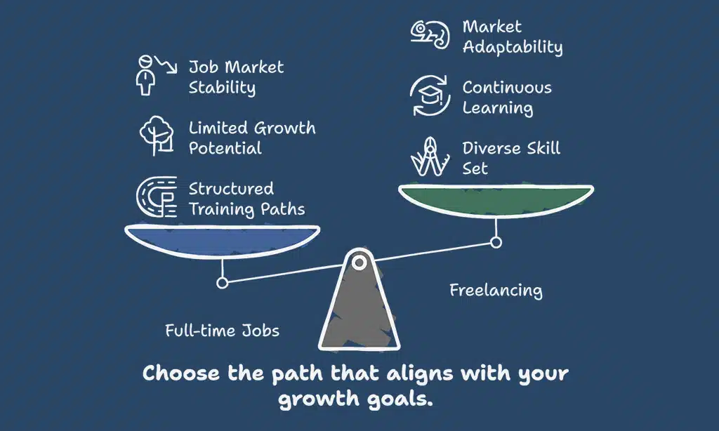 Full-time employment often provides structured training and mentorship programs that boost your skills. Freelancers must seek growth themselves through online courses, networking, and self-motivation.